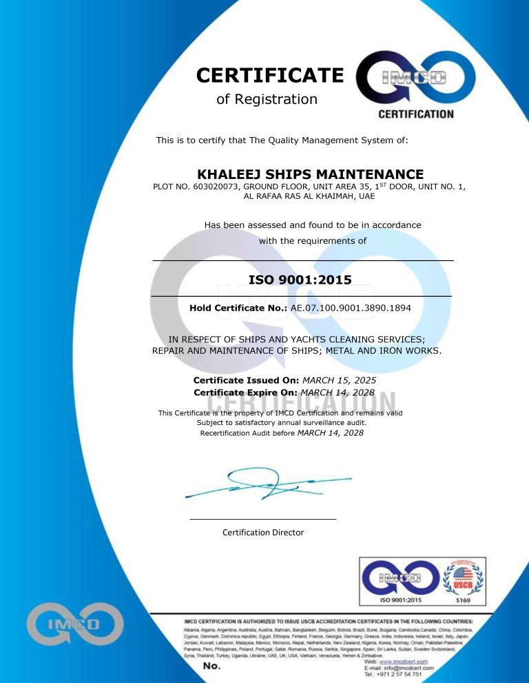 Khaleej Ships Maintenance LLC is a trusted name in the UAE’s maritime industry, offering high-quality ship repair and maintenance services. With a strong commitment to excellence, safety, and operational efficiency, we are proud to be ISO-certified, reflecting our adherence to international quality, environmental, and safety management standards.
